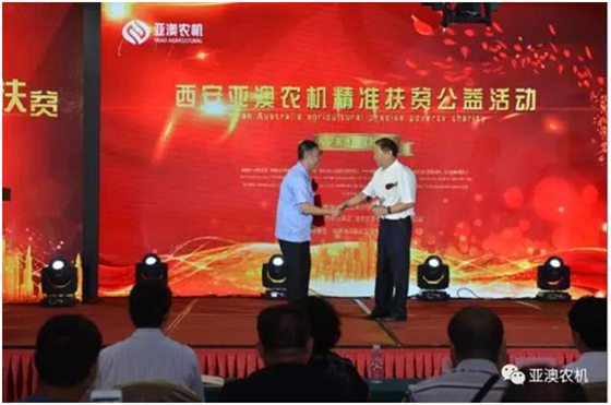 亞澳精準(zhǔn)扶貧公益活動(dòng)現(xiàn)場(chǎng),中國農(nóng)機(jī)化協(xié)會(huì)會(huì)長劉憲到會(huì)致辭,并給予亞澳頒發(fā)證書。